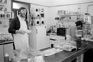 1984. Island Gardens Cafe: George Attewell, proprietor and former stevedore, serving customers