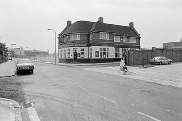 The ‘Magnet & Dewdrop’ situated on the corner of Westferry Road and Mast House Terrace, looking east. It was renamed ‘The Telegraph’ in 1985 but closed 10 years later. Following demolition in 2001, a block of flats was built on the site. The name is said to have its origins in the local iron and engineering trades, like the nearby but long-defunct ‘Ironmongers Arms'