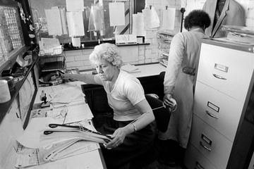 Disposing of coat hangers in the “Goods Inward” office. On the left, Islander Rose Wood, who worked in this warehouse office and used to book goods in. She started at 7 am and finished at 2, a “lonely job”. The work stopped when the men in the warehouse were told they would have to do their own paperwork. Rose was offered another job, as price-checker on the shop floor, she then went to work for the Association of Island Communities, in a post funded by the LDDC, in an employment agency. There was not a lot of work because in 1985 there was not a lot of work about for Islanders. She then worked for a firm of architects in Cannon Workshops, until after 8 years they returned to their office in Richmond. With Rose is her colleague ”Lorna”