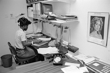Office worker Gale in the Hard Goods office. Comment in 2013: “You would never be allowed large calendars like this one in the office now, it’s all ‘clutter-free’ surfaces and walls.”
