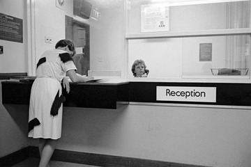 Office reception desk with Jan Devereaux behind the counter. In 2013 Jan was living in East Ferry Road