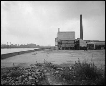 1986. View of the works and river wharf from the east, looking west. The chimney was the tallest built in East London