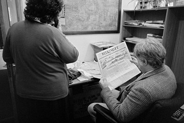 Ted Johns (right) and Pat Gibbs a social worker. They are in the Resource Centre, the office of the AIC at 151 Manchester Road (opposite Christ Church), where local residents were helped with housing employment and other problems, and where campaigns were co-ordinated in response to the perceived threats of redevelopment and the problems it created. The Mudchute Association and the Island History Project were also based here for a few years, and The Islander newspaper was edited and produced here