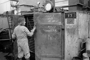 The trays of colour cake were dried in ovens to form solid blocks of colour. The purity of the colour was checked by sampling and then the batch was weighed and packed ready for dispatch