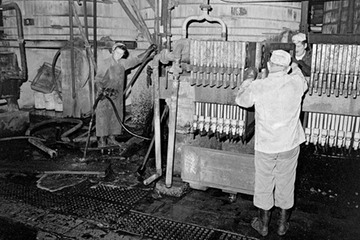 Once mixed and heated in the vats, the resulting slurry was poured into presses where the excess water was squeezed out to form a cake. The cake was then shovelled by hand onto trays ready for the drying ovens