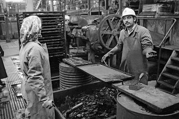 'Traying-up' in the Blue Plant. The colour cake came out of the presses still wet and was dried on trays in the oven