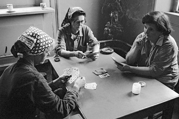 Ellen ? (left), Mary Cole (centre) and Kathy Steptoe (cleaner) playing cards in the canteen