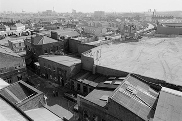 View from the factory roof looking east across Maconochies Wharf and Westferry Road towards Cubitt Town