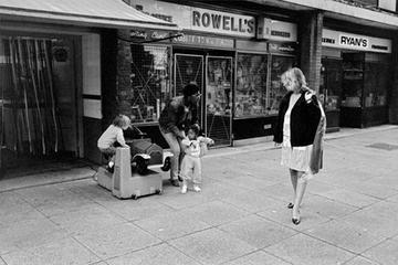 Children playing on a mechanical ride outside Rowell's stationer's and post office