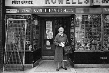 A pensioner (Nellie) outside Rowell's stationer's and Post Office