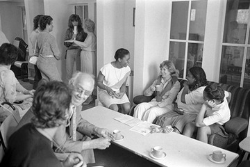 1984. Refreshments after the Sunday service at Christ Church. Councillor Bill Kilgour, seated, smoking a cigarette
