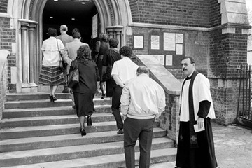 1985. Mourners entering the church for the funeral service,with vicar Rob Yeomans