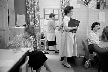 Teachers in the staff room. Standing, holding file, is Janet Maloney; seated on the right is Dave Humphries