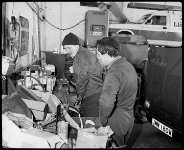 Mechanics John Darling (front) and George Westfallen inside the motor repair workshop at Cyclo Motors