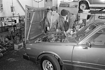 Cyclo Motors car repair garage on the corner of Manchester Road and Ferry Street - John Darling (left) and George Westfallen (right) servicing a car