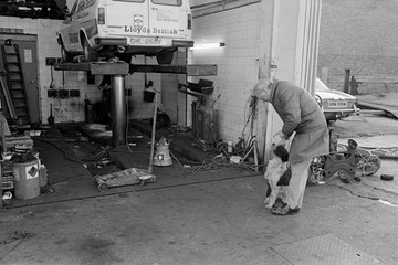 John Pittman, owner of Cyclo Motors, with his dog outside the motor repair shop