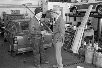 Cyclo Motors car repair garage on the corner of Manchester Road and Ferry Street - George Westfallen (mechanic - left) talking to Jimmy (Doggy) Emms, who always got the rolls for the morning break