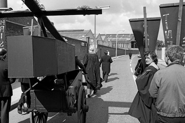 The march on Westferry Road opposite the Associated Lead Ltd. Paint Works site (left). Looking back, Megan Warner, headmistress of St. Luke’s School