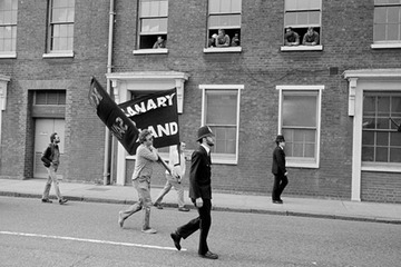 The march on Westferry Road, passing Burrell’s Wharf