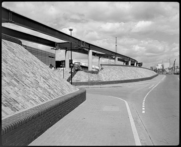 1985. Construction of the DLR alongside Limeharbour. Beyond the viaduct are some of the remaining cargo-handling sheds beside the Millwall Dock, built in the 1970s