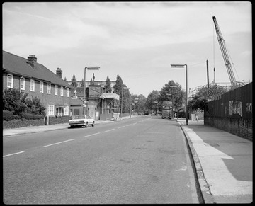 1985. Manchester Road looking east towards Christ Church with the site of the original Victorian railway bridge in the middle distance. This first bridge carried the Millwall Extension Railway; later a new bridge was built to carry the DLR to Island Gardens Station, then the terminus, until the station was moved underground, when it was demolished