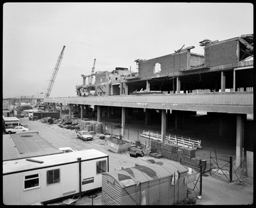 1985. Demolition of warehouses on the south side of South West India Dock, looking west. The curve of the DLR is in the distance on the left