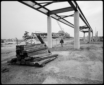 1985. Construction of the DLR alongside Marsh Wall, looking east, with the demolished ‘Shed 19’ in the background