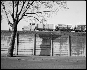January 1986. Works train on the DLR south of Crossharbour Station; East Ferry Road in foreground
