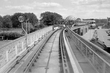 October 1987. View from the front of a DLR train as it approaches the terminus at Island Gardens