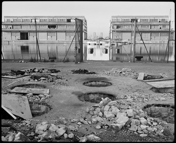 1985. Ground works for the DLR on West India Docks North Quay, looking south towards Canary Wharf