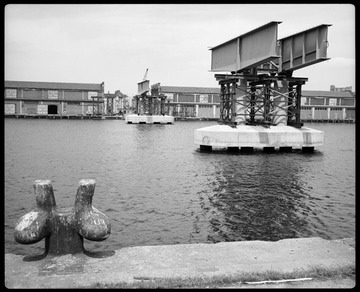 1985. Construction of the DLR over South West India Dock, looking north towards Canary Wharf