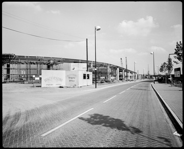 1985. Construction of the DLR alongside Marsh Wall, looking east, showing the curve between Heron Quays and South Quay stations