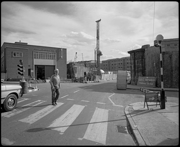 1985. Top of Westferry Road, looking south-east towards the John Rennie-designed sugar warehouses on the North Quay of West India Dock, built in 1802