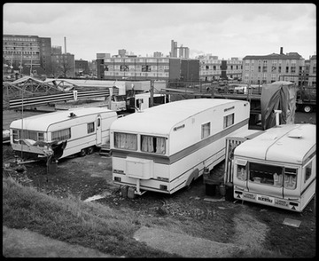 1984. Fun Fair caravans parked by the Pier Street entrance to the Mudchute, with Seysell Street and Stebondale Street flats in the background