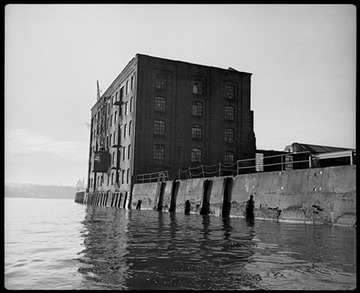 1984. Cubitt Town Wharf from the river. Situated at the end of Seysell Street, the warehouse was later converted into flats