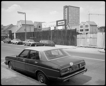 09 July 1985. View from Manchester Road of Newly-built houses in London Yard, with Kelson House on the Samuda Estate in the background