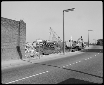 21 May 1985. Redevelopment of the west side of Preston’s Road by Poplar Dock, looking north. A section of dock wall has been removed