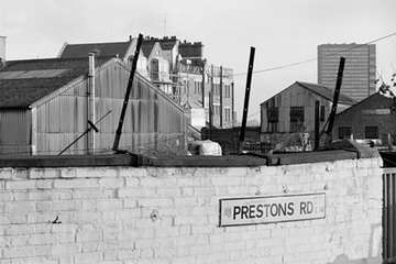 1985. Preston's Road, looking south across the wall towards Coldharbour (left) and Kelson House (right)
