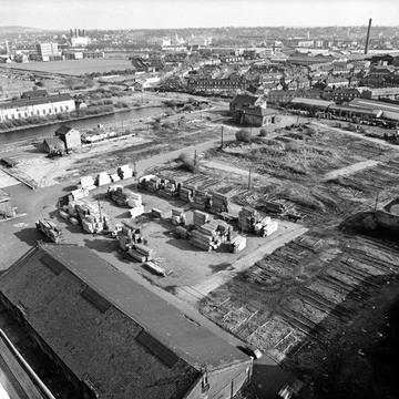 1983. View looking south-east from the roof of McDougalls Flour grain silos: in the picture are the Dry Dock and ship-repair works, Hesperus Crescent, Millwall Park and, in the distance, Greenwich