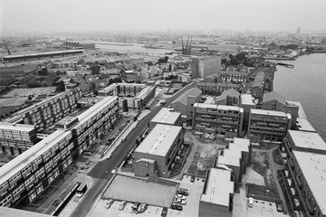 1983. View looking north over the Samuda Estate from the roof of Kelson House along Manchester Road towards the Blue Bridge and West India Docks