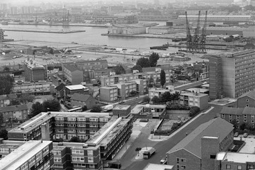 1983. View from the roof of Kelson House, looking north-west across the St. John’s Estate and West India Docks towards Canary Wharf