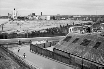 1985. View from Michigan House looking east across Westferry Road towards the demolition of McDougall’s Flour Mill grain silos on the south side of Millwall Outer Dock to make way for new housing