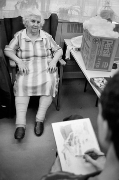 Will Adams, community artist, drawing a pensioner in the Lansbury Room