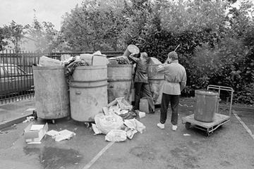 Caretakers sweeping up leaves in the school grounds: Keith Woodard on the right