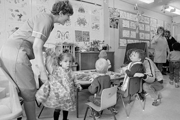 The White Room (Nursery): Jackie Diable (Nursery Officer) and Kim Boyce (Assistant Nursery Officer); Dione Moyse, Gary Johnwarren, Liam Burns, and his mum; Ashley Elliot Newman (one of twins). In the background, Mrs Newman with Kim Boyce and back view of Ricky Dublin