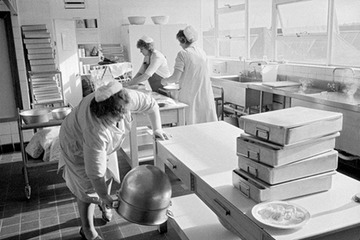 Preparing food in the kitchen: Mrs Mary Mansfield, Mrs Sheila Issitt and Mrs Christine Henshaw