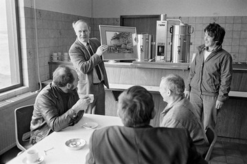 Presenting a picture of Brunel's steamship 'Great Eastern' under construction in Millwall to the hosts at Harlingen Shipyard. Eve Hostettler is on the right