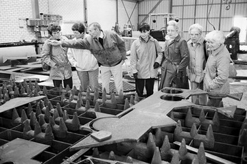 Fabrication shop at Harlingen Shipyard: includes Val Martin and her sister, John Penn, one unknown, Olive Campbell and Ada Price