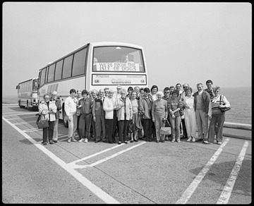 Stopover at a cafe at a cafe on the Afsluitdijk between North Holland and Friesland. Left to right: Eileen Bannister, Bernard Bannister, -, Olive Hook, -, -, Maud Dyer, Arthur Wiggins, Vera -, Nell Humphries, Eve Hostettler, Doris McCartney, Les Towler, Martha McCartney, -, Betty Coombes, Ada Price, Jasmine Pye, George Pye, Sylvie Wade, Peter Wade, Arthur Coombes, Buddie Penn, John Penn, Tony Wailey and Doris Emms
