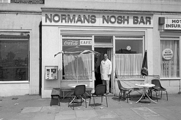 1984. Norman standing at the entrance to his Nosh Bar, situated in a row of shops in Arethusa House at the corner of Westferry Road and Cahir Street